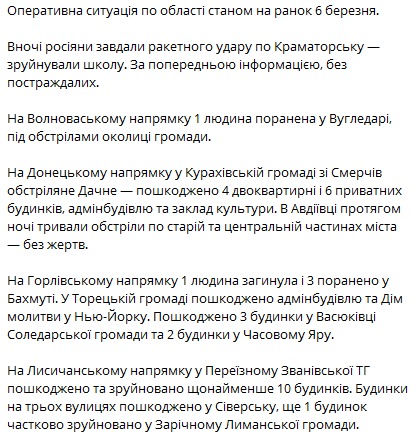 Ночью 6 марта россияне нанесли ракетный удар по Краматорску и другим населенным пунктам Донецкой области.