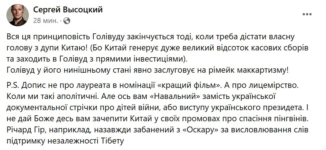 Экс-депутат Сергей Высоцкий полагает, что "Голливуд в его нынешнем состоянии явно заслуживает римейка маккартизма". Он раскритиковал декларируемую аполитичность киноакадемии и назвал ее "лицемерием": "Но вот вам "Навальный" вместо украинской документальной ленты о детях войны или выступления украинского президента".
