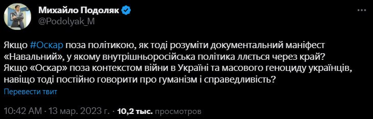 "Если "Оскар" вне политики, то как понимать документальный манифест "Навальный", в котором внутренняя российская политика льется через край? Если "Оскар" вне контекста войны в Украине и массового геноцида украинцев, зачем тогда вы постоянно говорите о гуманизме и справедливости?" - написал он в Twitter.