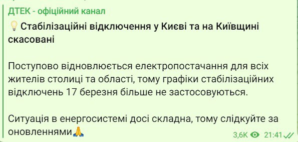 "Постепенно возобновляется электроснабжение всех жителей столицы и области, поэтому графики стабилизационных отключений 17 марта больше не применяются", – говорится в сообщении.