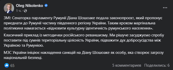 "Классический пример из методики русского реваншизма. Мы решительно осуждаем попытку подвергнуть сомнению территориальную целостность Украины, подрывать дух добрососедства между Украиной и Румынией", - сообщил Николенко.