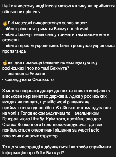 • подорвать доверие общества и военных к решениям командования по Бахмуту,