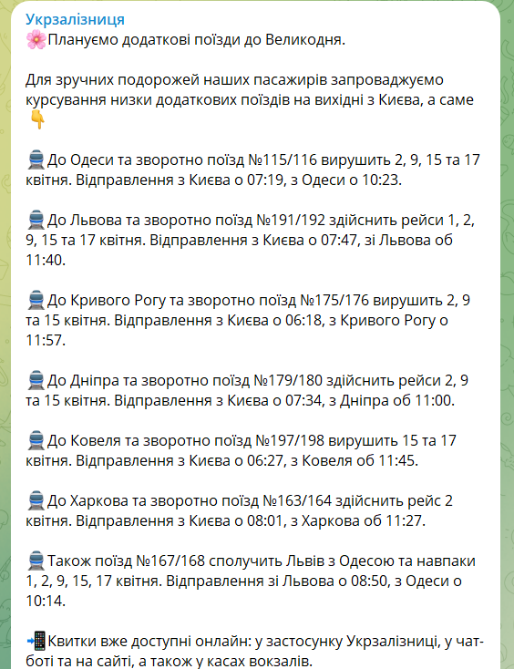 "Укрзализныця" запускает к Пасхе дополнительные поезда. В частности, для удобных поездок вводится курсирование ряда дополнительных поездов на выходные из Киева.
