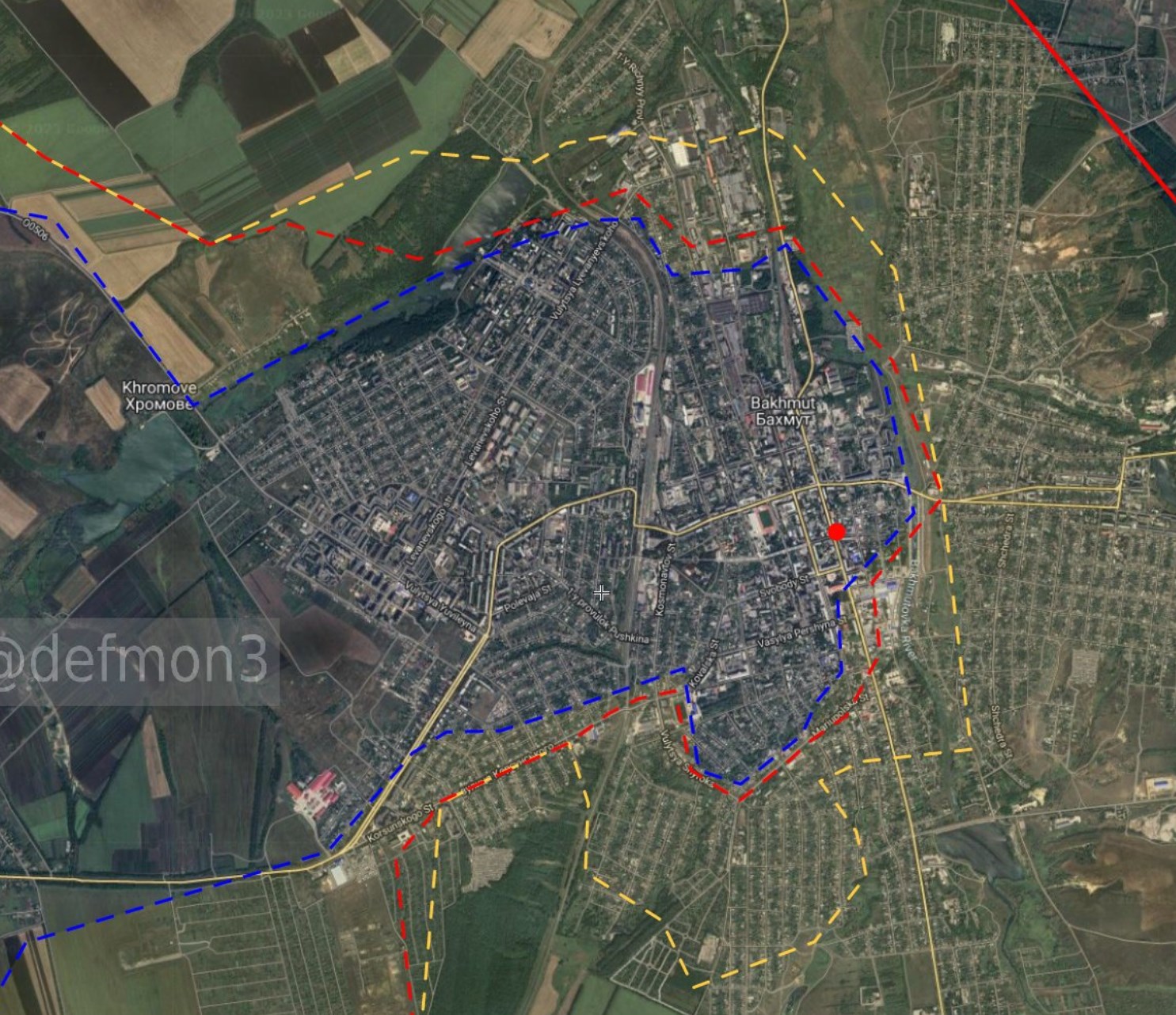 "Вагнер" параллельно заявил, что их флаг находится в 300 метрах от горсовета. Приблизительное место расположения флага обозначил на карте американский военный блогер DefMon.