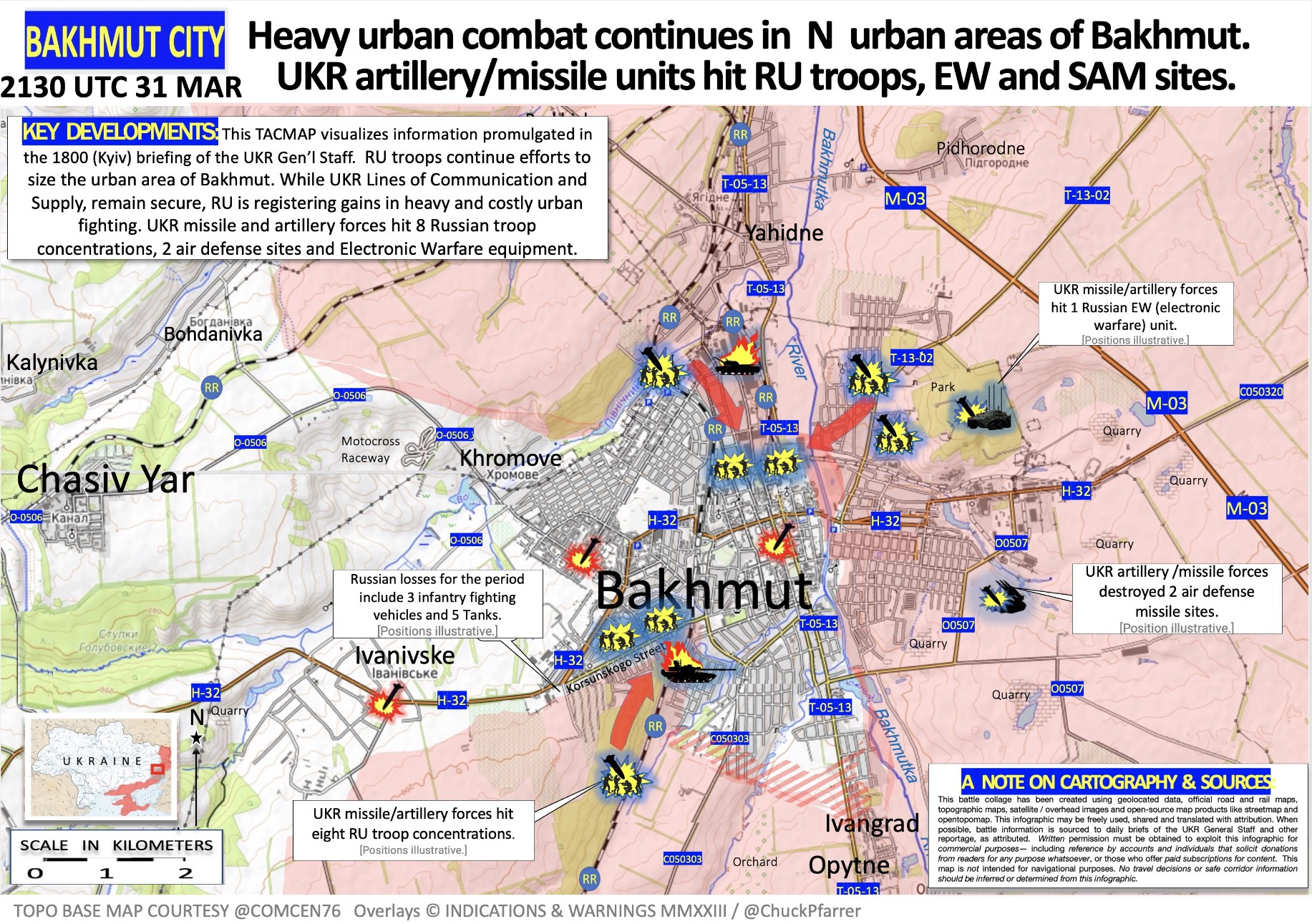 "Институт" пишет также о контратаке ВСУ юго-западнее Бахмута, где украинские силы вернули утраченные позиции южнее Ивановского к юго-западу от города. Генштаб, как мы видели выше, сообщал об атаках россиян под Ивановским.