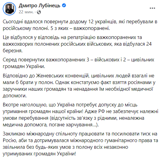 "Согласно Женевским конвенциям, гражданских людей вообще не должны брать в плен. Однако констатируем факт взятия россиянами в заложники наших граждан и неоказание им необходимой медицинской помощи", - написал Лубинец.