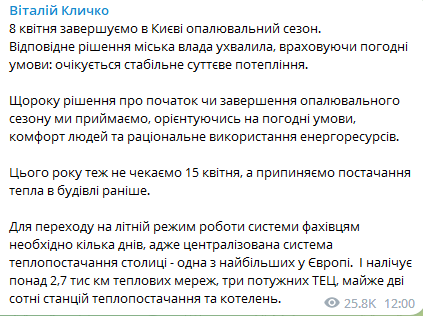 "В этом году тоже не ждем 15 апреля, а прекращаем поставки тепла в здании раньше. Для перехода на летний режим работы системы специалистам необходимо несколько дней, ведь централизованная система теплоснабжения столицы – одна из самых больших в Европе. И насчитывает более 2,7 тыс. км тепловых сетей, три мощных ТЭЦ, почти две сотни станций теплоснабжения и котельных", - написал он.