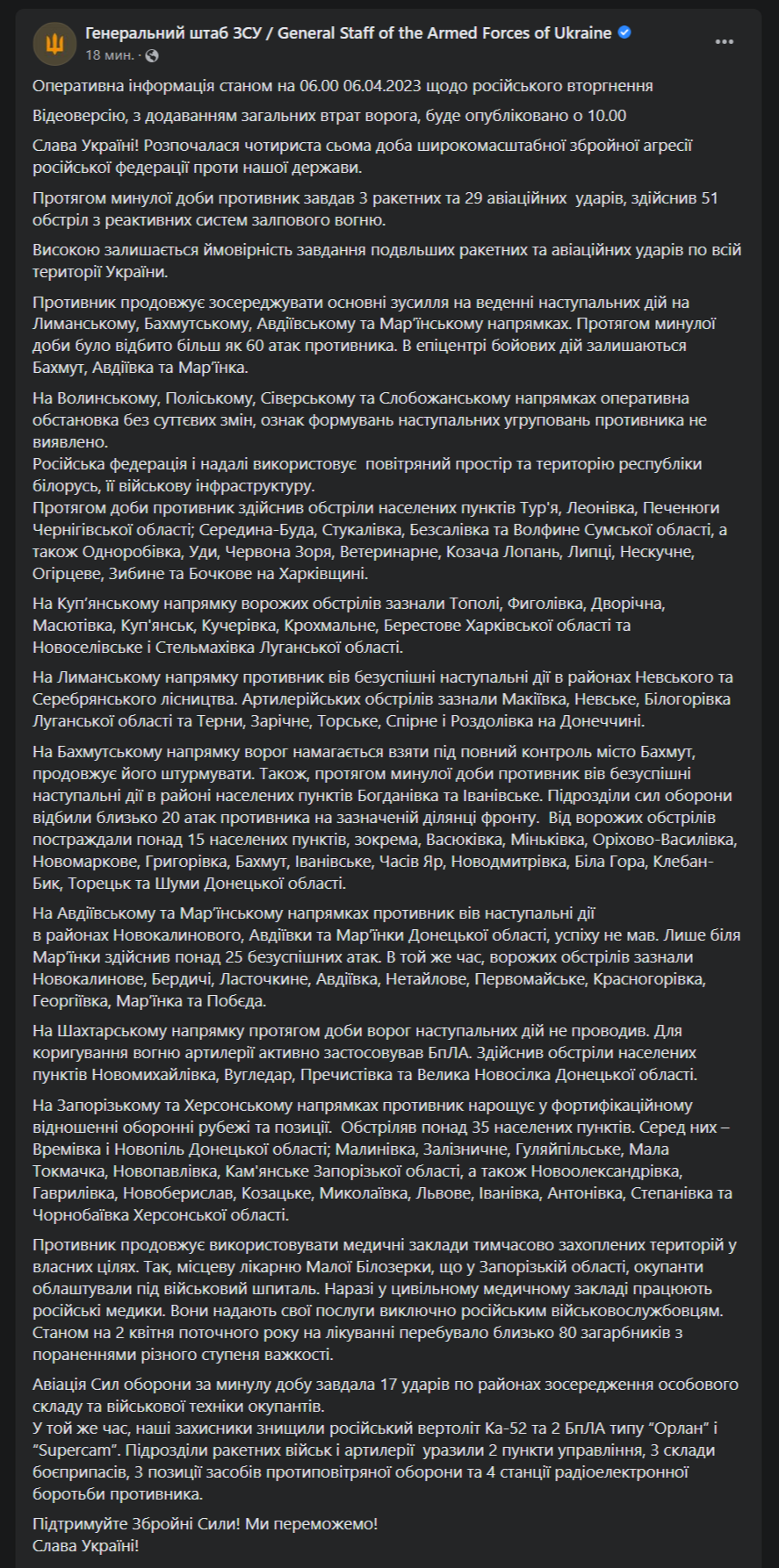 06:30 Сводка Генштаба ВСУ на утро 6 апреля.