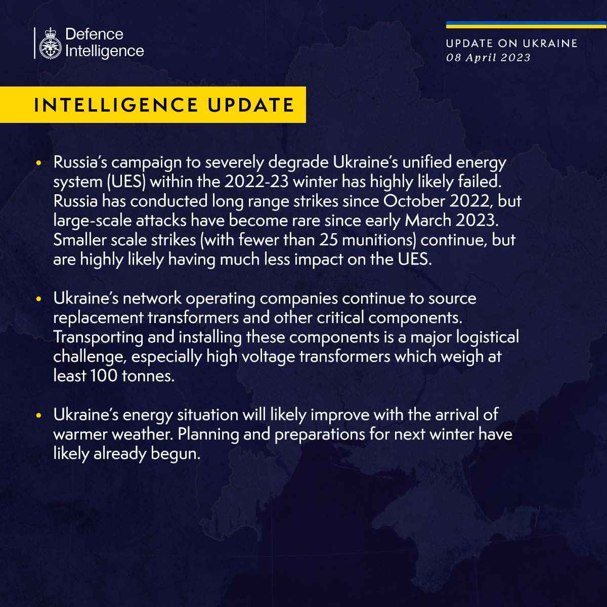 "Российская кампания с целью нанести серьезный ущерб объединенной энергосистеме Украины зимой 2022-2023 годов, скорее всего, провалилась. Россия наносила дистанционные удары с октября 2022 года, однако масштабные атаки стали более редкими с начала марта 2023 года. Атаки меньшего масштаба (до 25 ракет) продолжаются, но, скорее всего, имеют гораздо меньшее влияние на энергосистему", - отмечает разведка.