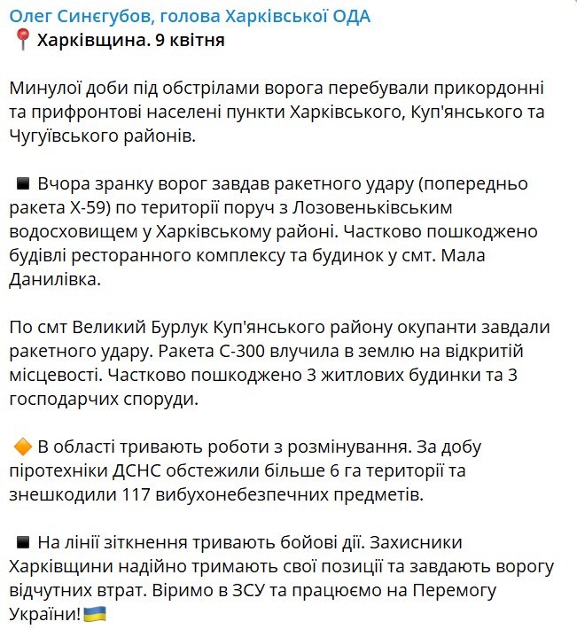 Об этом сообщает глава Харьковской ОВА Олег Синегубов.