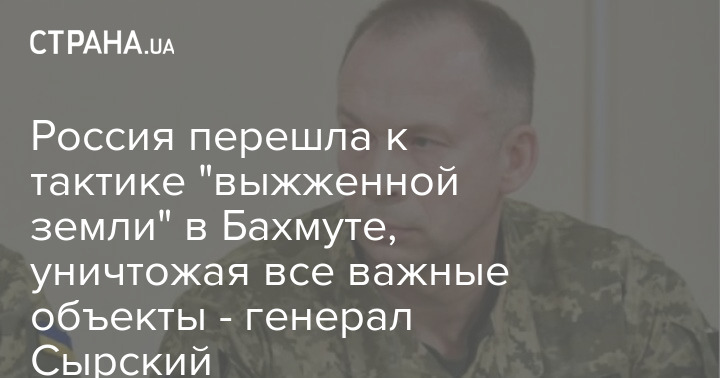 Командующий сухопутными войсками ВСУ Александр Сырский заявил, что Россия перешла к тактике "выжженной земли" в Бахмуте, что подразумевает уничтожение любых важных объектов, чтобы они не достались врагу.