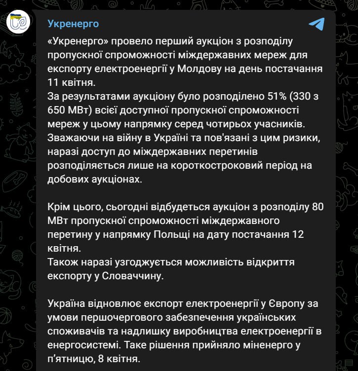 Компания "Укрэнерго" сообщает, что провела первый аукцион по распределению энергомощностей для экспорта в Молдову. А 12 апреля состоится аналогичный аукцион по продаже света в Польшу.