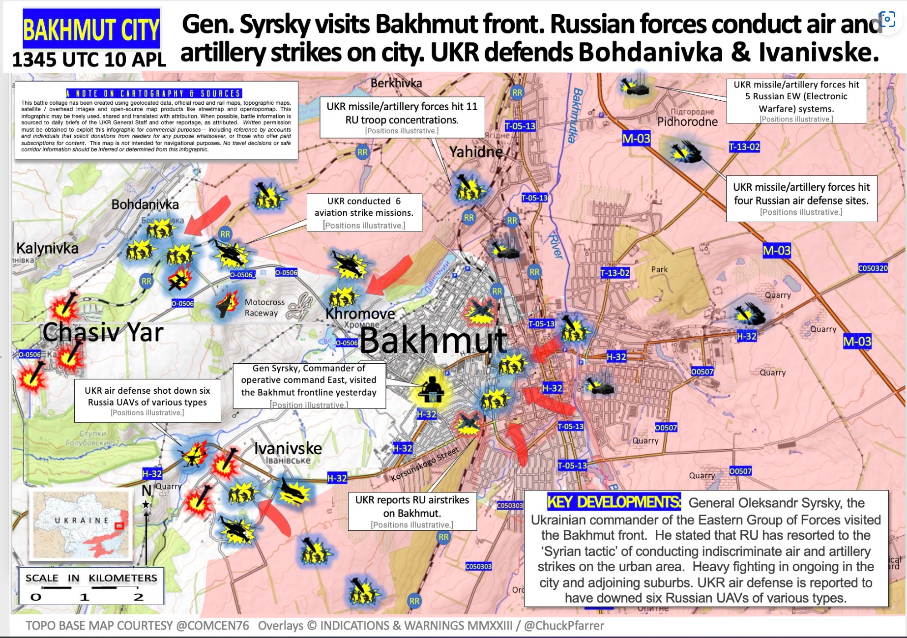 В частности, по словам Сырского, Россия в Бахмуте "уничтожает здания и позиции ударами авиации и огнем артиллерии". По его словам, Украина истощила "Вагнер" в Бахмуте и теперь РФ вынуждена "привлекать к боям за Бахмут спецназовцев и десантно-штурмовые подразделения".