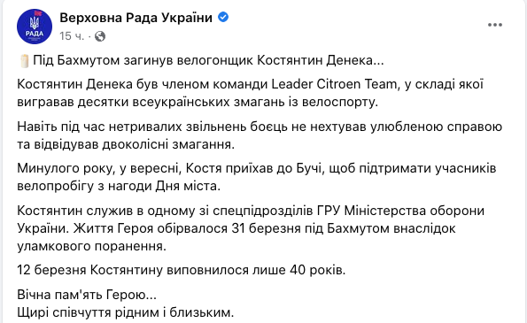 Под Бахмутом погиб украинский велогонщик Константин Денека, который служил в спецподразделении Главного управления разведки Минобороны. Ему было 40 лет.