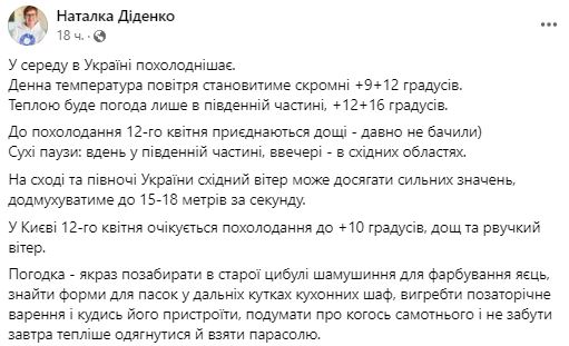 К похолоданию 12 апреля присоединятся дожди. На востоке и севере Украины восточный ветер может достигать сильных значений, будет дуть до 15-18 метров в секунду.