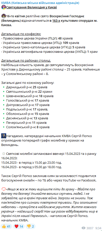 Как писала "Страна", в Киеве на выходных усилят меры безопасности из-за Пасхи. При этом в Пасхальную ночь не будут отменять комендантский час.