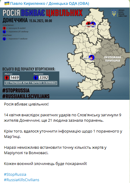 "Кроме этого, удалось уточнить информацию об одном раненом в Марьинке. В настоящее время невозможно установить точное количество жертв в Мариуполе и Волновахе. Каждый военный преступник будет наказан!", - написал Кириленко.