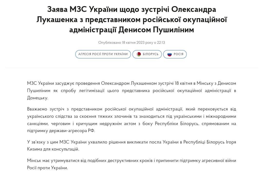 "Считаем встречу с представителем российской оккупационной администрации, который скрывается от украинского следствия за совершение тяжких преступлений и находится под украинскими и международными санкциями, очередным и вопиющим недружественным актом со стороны Республики Беларусь", - заявило ведомство.