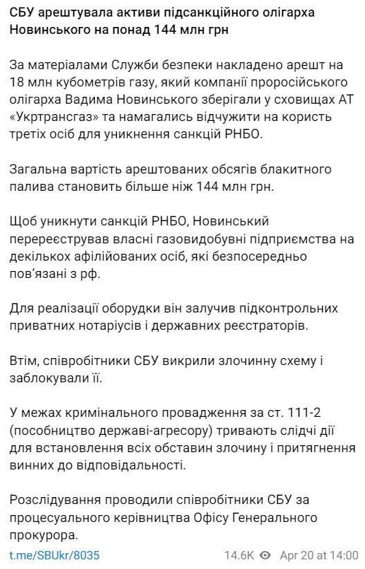 Напомним, СБУ считает, что Вадим Новинский пытался перерегистрировать свои предприятия, чтобы избежать санкций СНБО. На прошлой неделе на его предприятиях прошли обыски. В ходе обысков были обнаружены документы, печати компаний-нерезидентов и прокремлевская религиозная литература, заявили в СБУ.