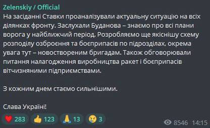 "Проанализировали актуальную ситуацию на всех участках фронта. Заслушали Буданова – мы знаем обо всех планах врага в ближайший период. Разрабатываем еще более качественную схему распределения вооружения и боеприпасов по подразделениям, особое внимание здесь – новосозданным бригадам.