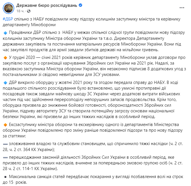 Государственное бюро расследований (ГБР) совместно с НАБУ сообщили о новом подозрении двум бывшим чиновникам Минобороны, причастным к нанесению ущерба государству на миллионы гривен.