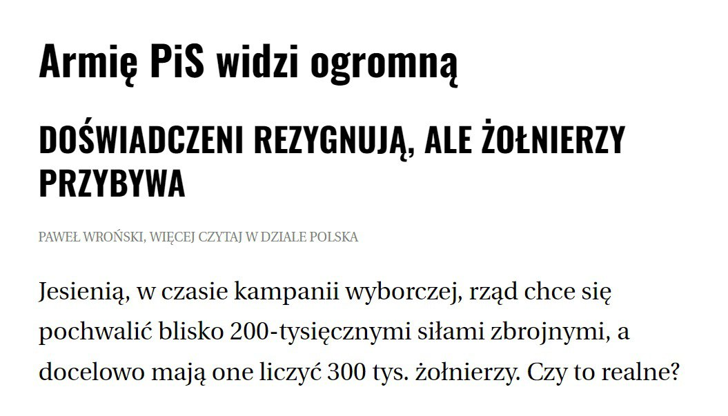 "Осенью правительство хочет похвастаться вооруженными силами численностью почти 200 000 человек, поставив цель довести их численность до 300 000 военнослужащих. Министр обороны Блащак: "Нам нужно еще два года, и тогда польская армия станет самой сильной сухопутной армией в Европе".