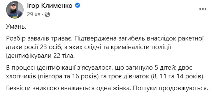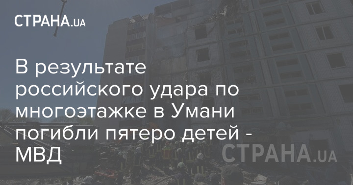 Во время идентификации тел выяснилось, что в результате удара российской ракеты по многоэтажке в Умани, погибли пять детей.