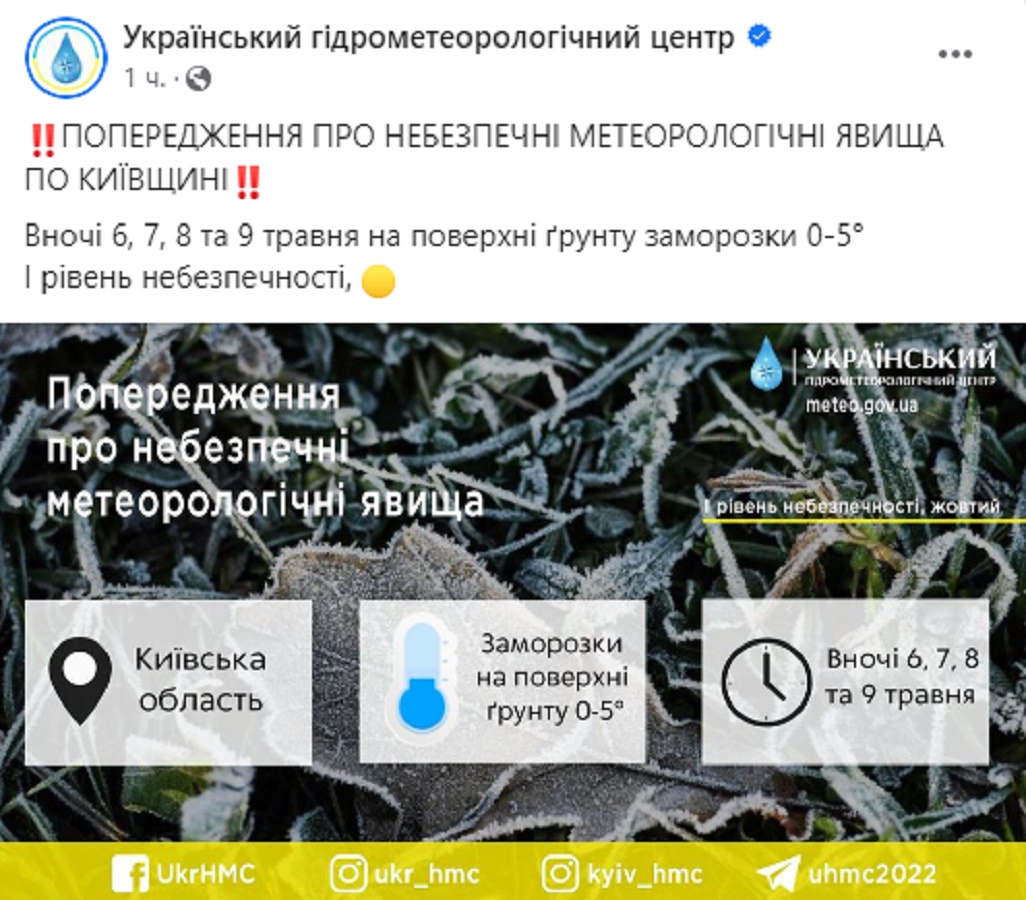 В северных, в северо-западных областях, Винницкой, Черкасской областях ночью 6 мая ожидаются заморозки на почве 0...-5 (I уровень опасности, желтый), по всей Украине – кроме южной части, Закарпатья и Прикарпатья – 7,8 и 9 мая.