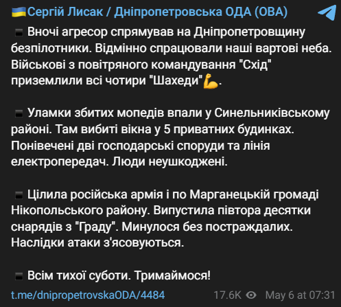 Также над Днепропетровской областью сбили с утра еще один беспилотник, сообщил Лысак. Это уже пятый по счету, начиная с ночи.