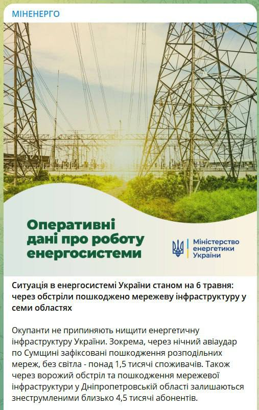 "В частности, из-за ночного авиаудара по Сумщине зафиксированы повреждения распределительных сетей, без света - более 1,5 тысяч потребителей", - пишет пресс-служба министерства.