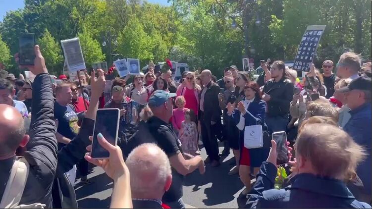 Паблики сообщают, что сначала немецкая полиция не пропускала тех, кто пришел с российской символикой, в частности, флагами РФ и георгиевскими ленточками, использование которых запретил суд.