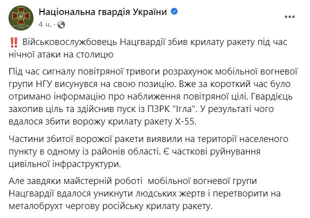 "При сигнале воздушной тревоги расчет мобильной огневой группы Нацгвардии Украины выдвинулся на свою позицию. Уже через короткое время была получена информация о приближении воздушной цели. Нацгвардеец захватил цель и совершил пуск из ПЗРК "Игла". В результате чего удалось сбить вражескую крылатую ракету Х-55", - говорится в сообщении.