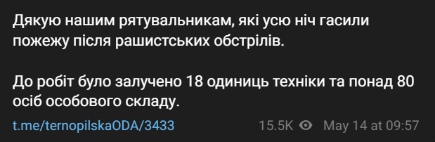 Губернатор Владимир Труш в своем телеграм-канале сообщил, что пожар в результате обстрела тушили всю ночь.