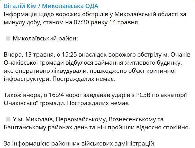 Также вчера враг наносил удары с РСЗО по акватории Очаковской громады. По словам Кима, пострадавших нет.