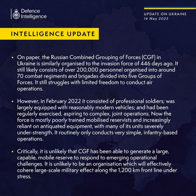 "Однако в феврале 2022 году они состояли из профессиональных солдат, были в основном оснащены достаточно современными средствами передвижения и регулярно тренировались, стремясь к сложным совместным операциям. В настоящее время силы состоят в основном из плохо обученных мобилизованных резервистов и все больше зависят от устаревшего оборудования, при этом многие из их подразделений сильно недоукомплектованы и способны только на очень простые пехотные операции", - пишет британская разведка.