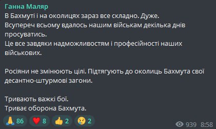 "Армия РФ оказывает дикое сопротивление. За эти сутки на Бахмутском направлении произошло 34 боевых столкновения, 479 обстрелов разными системами, разной артиллерией, 4 авианалета", - отметил он.