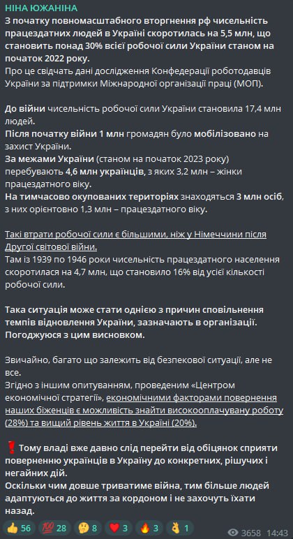 09.40 Число трудоспособных украинцев с начала вторжения сократилось на 5,5 миллионов человек или на 30%.