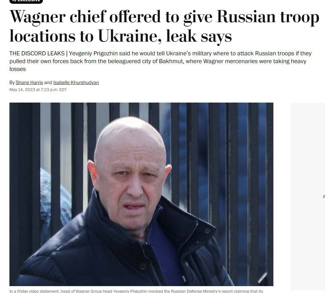Сегодня газета со ссылкой на утечки Пентагона написала, что куратор "Вагнера" предлагал слить данные о местонахождении армейских частей РФ взамен на уход ВСУ из Бахмута.
