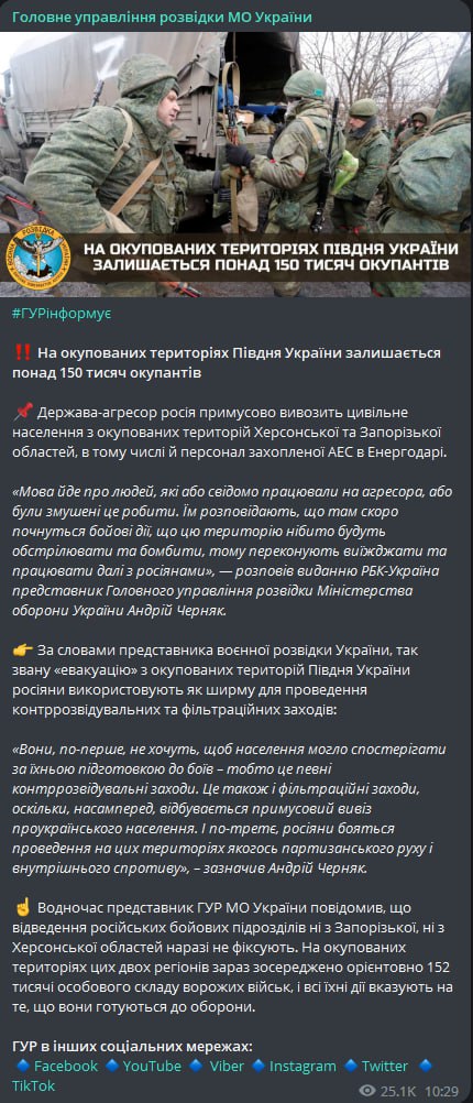Также сообщается, что "эвакуация" с юга Украины необходима для оправдания фильтрационных и контрразведывательных мероприятий россиян.
