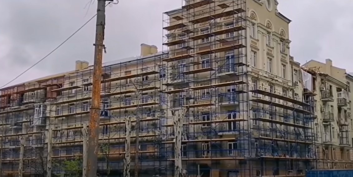 То, что все же отстраивают россияне, громко рекламируется. Новый квартал, который во время поездки посещал Путин, называется ЖК Невский (тоже отсылка к Петербургу). На его фасаде нарисовали девушку в цветах триколора.