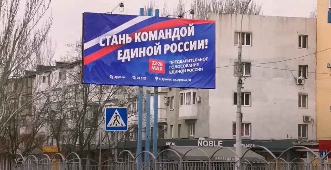 В городе масса элементов "русского мира": флаги "ДНР" и России, приглашение к участию в российских праймериз на местные "выборы" 10 сентября, баннер про Крым, стела, выкрашенная в цвета российского флага.