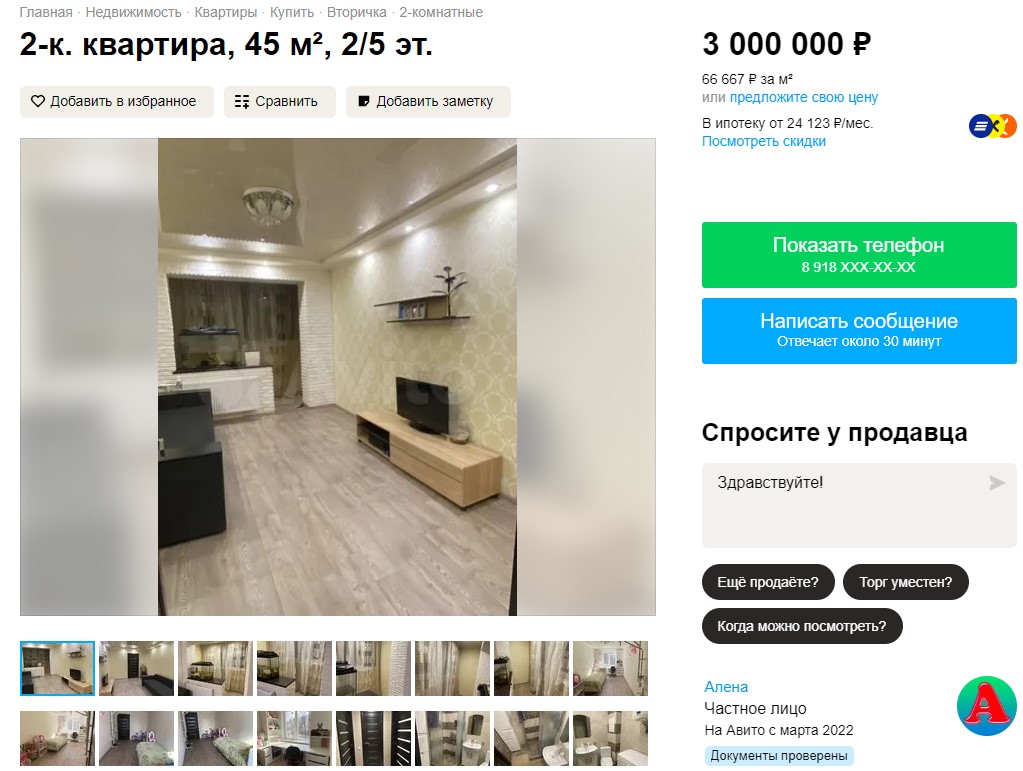 "Во время "СВО" дом практически не пострадал, ведется капитальный ремонт всего дома. Квартира не пострадала, только штукатурка осыпалась и т.п. Дом располагается в спальном районе. До моря 20-30 минут пешком. Школа и детский сад в 3 минутах ходьбы", — пишет собственник и просит 1,5 млн рублей (700 тысяч гривен).