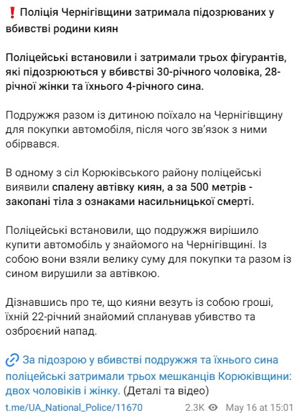 По данным правоохранителей, 30-летний мужчина, его 28-летняя жена и четырехлетний сын отправились в Черниговскую область для покупки авто, после чего 14 мая связь с ними оборвалась.