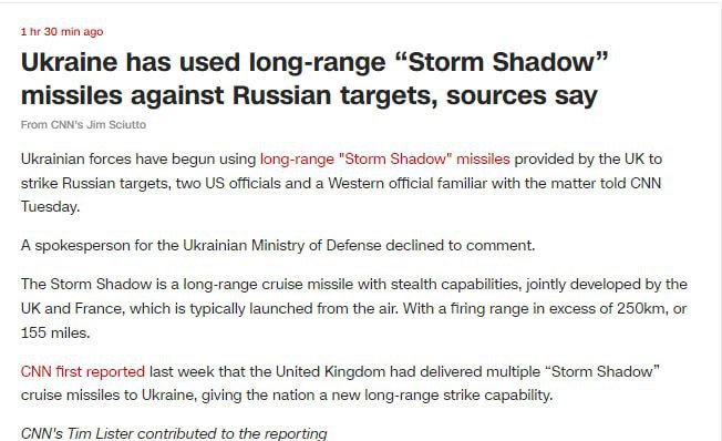ВСУ уже начали использовать ракеты большой дальности Storm Shadow, недавно предоставленные Великобританией, для ударов по российским целям.