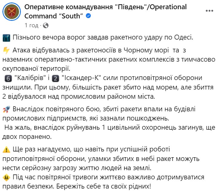 Последствия падения ракет в Одесской области. Фото: facebook.com/OperationalCommandSouth