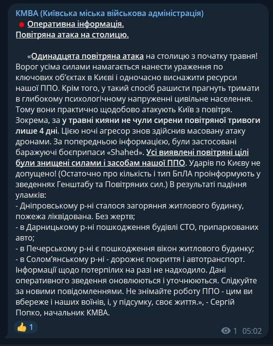 Этой ночью россияне атаковали Киев дронами "Шахед", все цели были сбиты. Есть возгорание от падения обломков.