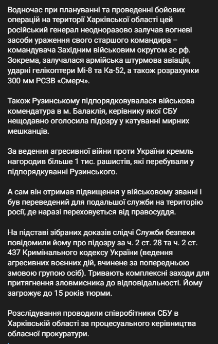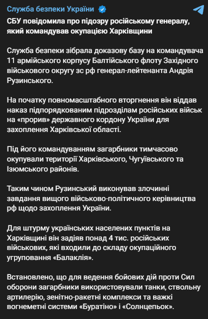 Служба безопасности Украины сообщила о подозрении российскому генералу, командовавшему захватом Харьковской области. Это командующий 11-го армейского корпуса Балтийского флота Западного военного округа генерал-лейтенант Андрей Рузинский.
