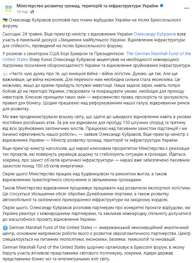 Об этом рассказал вице-премьер по восстановлению - министр развития громад, территорий и инфраструктуры Александр Кубраков.