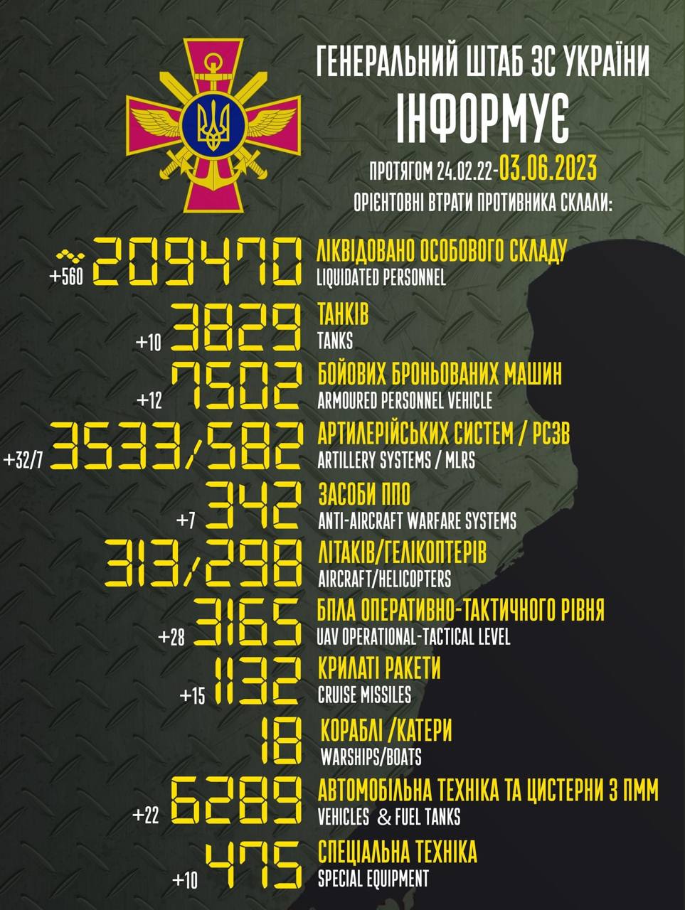 Потери России в войне в Украине на утро субботы, 3 июня, составили 560 оккупантов, общее число потерь российской армии с начала вторжения составляет 209470 военных. Кроме того, ВСУ уничтожили 10 танков, 12 ББМ и 32 артсистем за сутки.