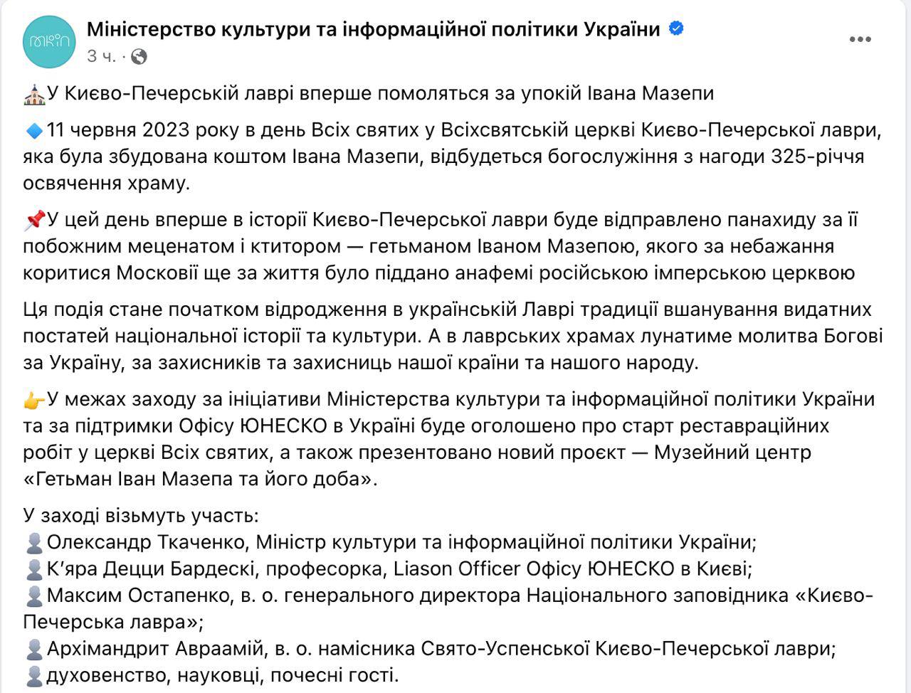 В панихиде примут участие министр культуры Ткаченко, назначенный ПЦУ и.о. наместника Лавры Авраамий, и.о. гендиректора Нацзаповедника Киево-Печерская лавра и другие лица.